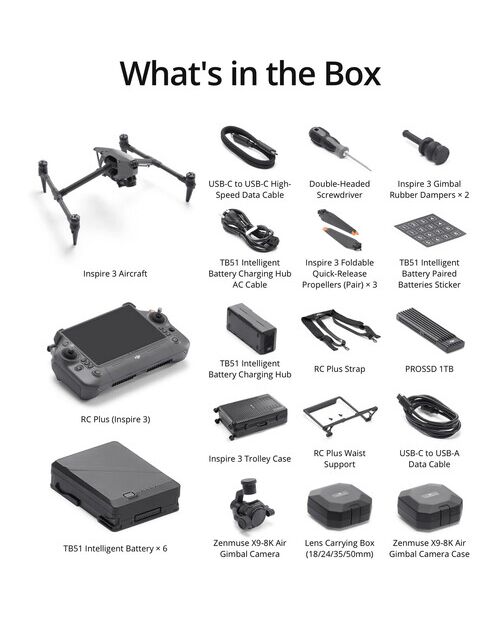 В комплекте шесть батарей TB51 и зарядный хаб. Каждая пара легких батарей обеспечивает до 28 минут полета и поддерживает горячую замену. Интеллектуальные батареи имеют функцию автоматического подогрева для работы при температурах до -20°C. Зарядный хаб может зарядить две батареи до 90% за 35 минут (быстрый режим) или восемь батарей до 100% за 160 минут.