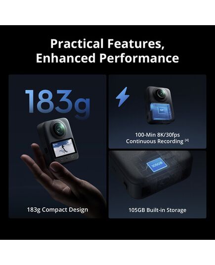 Osmo 360 обладает 128 ГБ встроенной памяти для записи видео без необходимости во внешней карте. Хранилище можно расширить с помощью слота microSD, который поддерживает использование быстрых карт объемом до 1 ТБ для часов высококачественной записи.