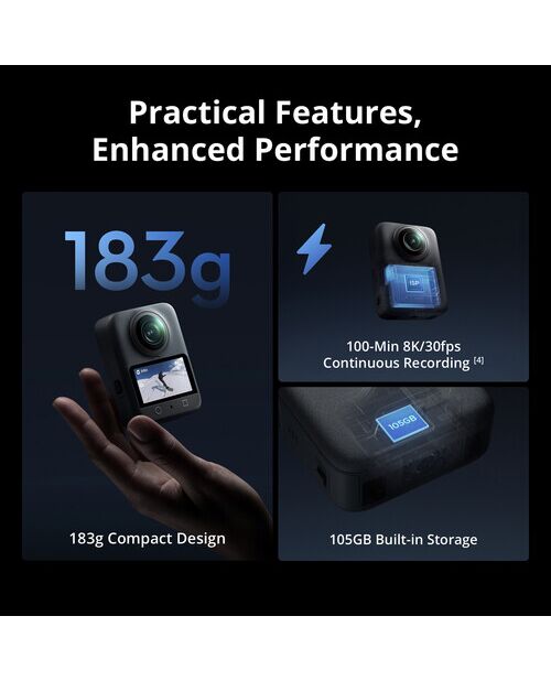 Новый сенсор 1" CMOS в паре с двумя широкоугольными объективами обеспечивает съемку в формате 360° с минимальным энергопотреблением. Инновационная схема распределения пикселей позволяет снимать 360° видео в 8K30, а ультраширокий динамический диапазон камеры сопоставим с профессиональными кинокамерами.