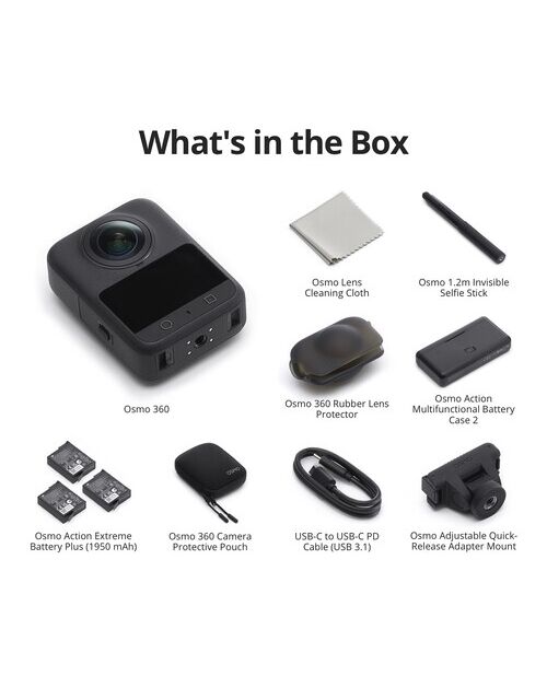 Откройте для себя новый уровень съемки с экшн-камерой DJI Osmo 360 Adventure Combo — ультракомпактной системой, способной захватывать кинематографические 360° видео и фотоснимки с разрешением до 8K. Этот мощный представитель линейки Osmo оснащен двумя линзами для полного обзора на 360°, большим сенсором 1" с превосходной работой при слабом освещении, ярким 2" сенсорным экраном и множеством интеллектуальных функций. Комплект Adventure Combo включает в себя 1.2-метровую селфи-палку, регулируемый адаптер быстрого съема и многофункциональный чехол для батареи.