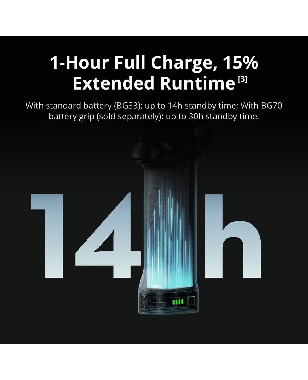 В сочетании с рукояткой-аккумулятором BG33 стабилизатор RS 5 полностью заряжается всего за 1 час при использовании зарядного устройства мощностью 65W с поддержкой Power Delivery. Время непрерывной работы достигает 14 часов — на 15% больше, чем у предыдущей модели RS 4. С более емкой рукояткой BG70 время работы может быть увеличено до рекордных 30 часов.