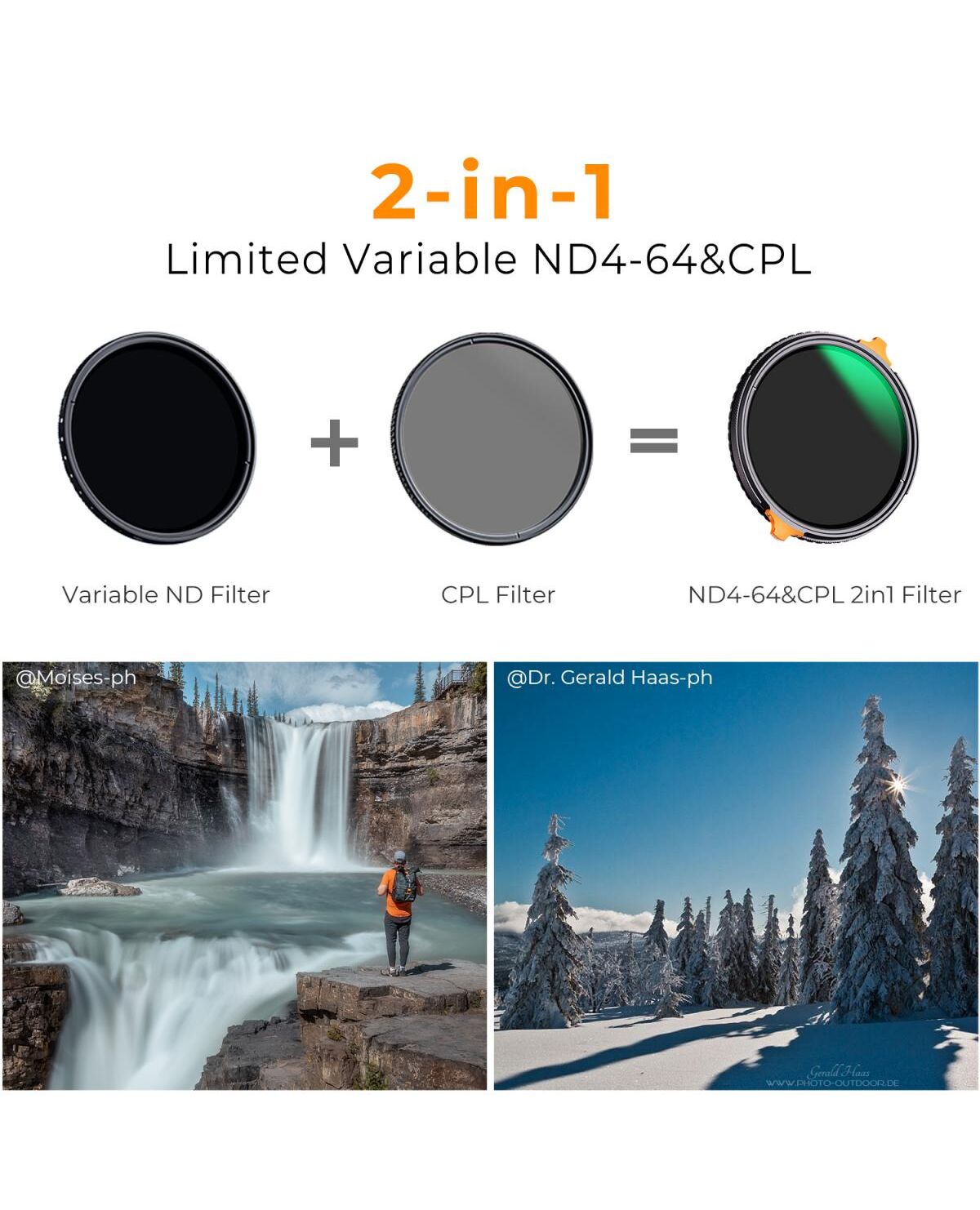 Комбинированный фильтр, объединяющий функции переменного ND-фильтра и CPL-фильтра в одном компактном решении. Идеально подходит для фотографов и видеографов, работающих в условиях переменного освещения. Благодаря запатентованной технологии Nano-X обеспечивает высокую четкость изображения, защиту от воды, царапин и паразитных бликов.