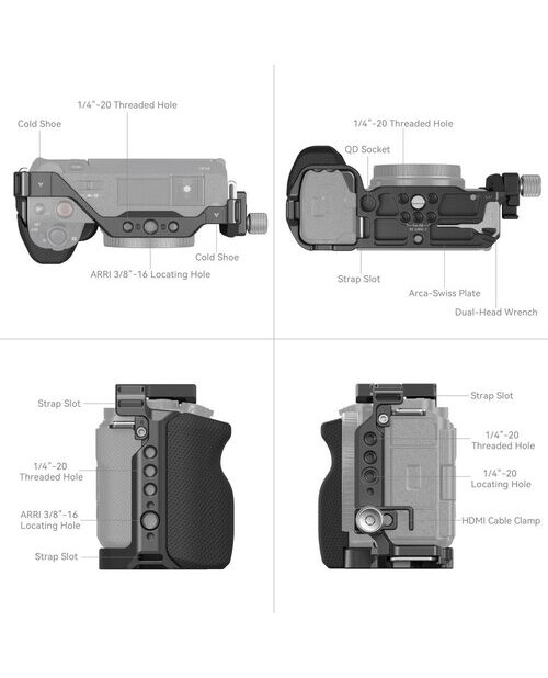 - Доступ к элементам управления: Конструкция клетки обеспечивает полный доступ ко всем кнопкам, разъемам и отсекам камеры, включая батарейный отсек и порты HDMI/USB.