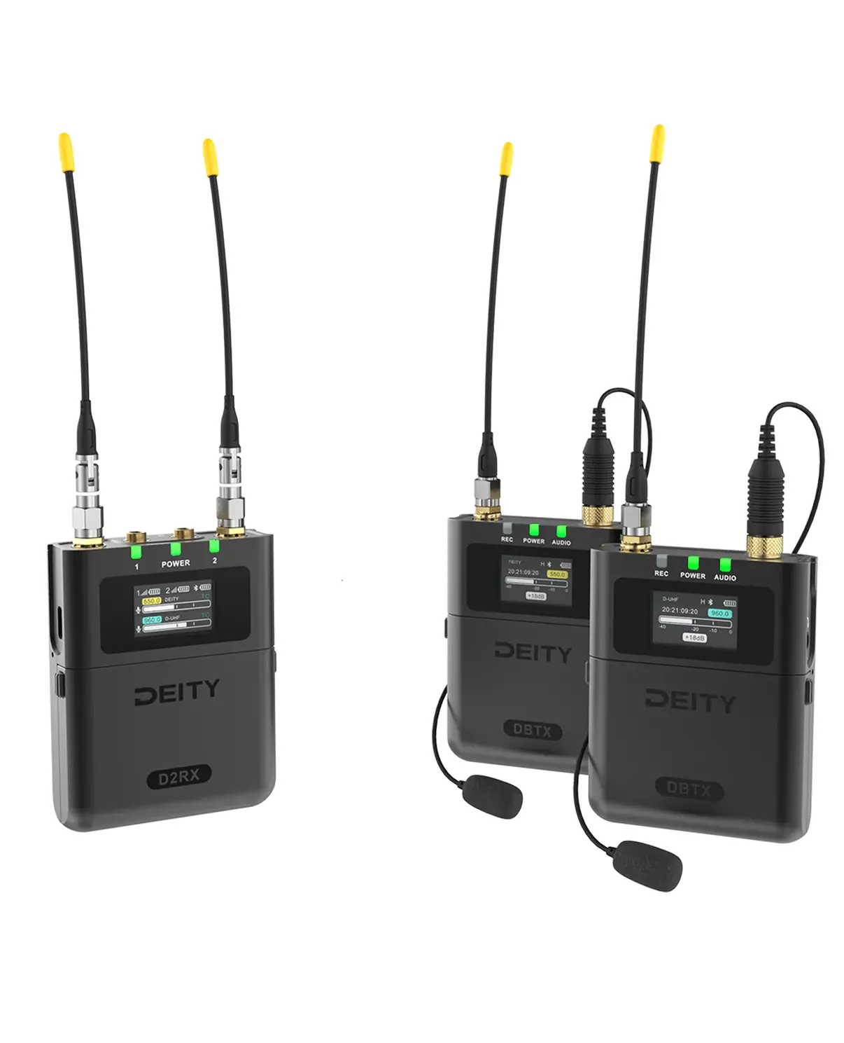 В основе системы лежат два компактных передатчика DBTX, инженерная прочность которых обеспечена фрезерованным алюминиевым шасси. Устройства оснащены блокируемыми 3.5 мм входами (совместимыми с разъёмами Sennheiser), что гарантирует надёжное подключение гарнитур или петличных микрофонов без риска случайного отключения во время активной съёмки. Каждый передатчик поставляется в комплекте с все направленным петличным микрофоном, готовым к немедленному использованию.