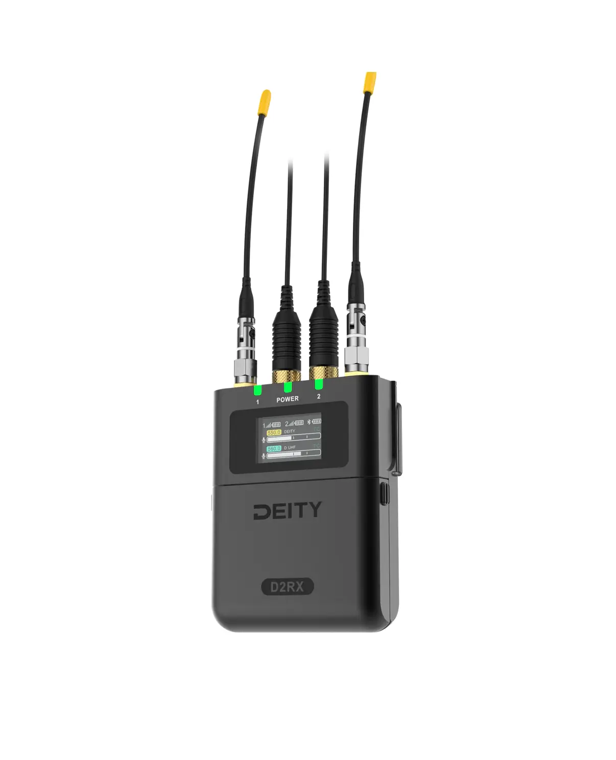 Компактный приёмник D2RX, выполненный в таком же прочном алюминиевом корпусе, предназначен для крепления на "холодный башмак" камеры. Устройство принимает сигнал одновременно от двух передатчиков, позволяя записывать диалог двух людей на один рекордер.
