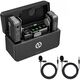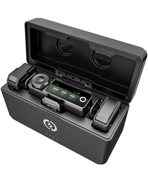В комплект поставки системы входит компактный зарядный футляр, способный увеличить время работы каждого компонента до 22 часов при полной зарядке. Каждый передатчик сам по себе имеет время работы 7,5 часов, а приемник – 9 часов и может заряжаться и работать одновременно. Светодиодные индикаторы на корпусе позволяют следить за состоянием его батареи.