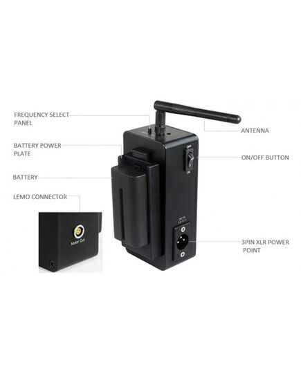 - Работает от аккумулятора 7.2V Sony NP-F или постоянного тока 12V на входе через трехштекерный разъем XLR