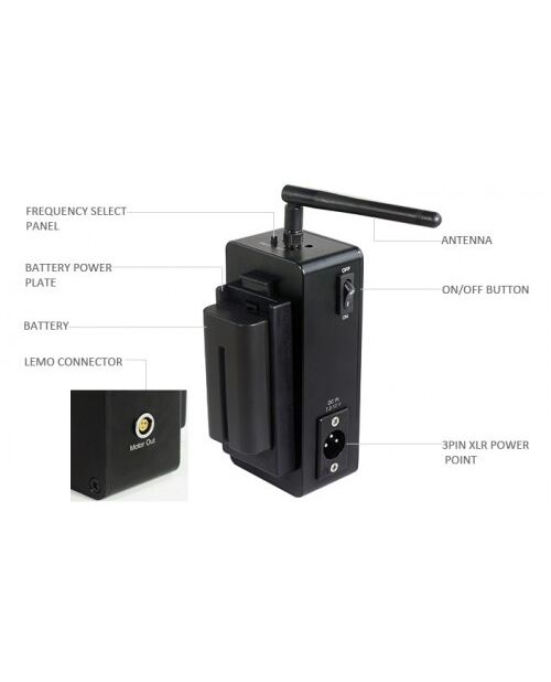 - Приемник работает от стандартного четырехштекерного XLR-разъема с мощностью 12V на входе