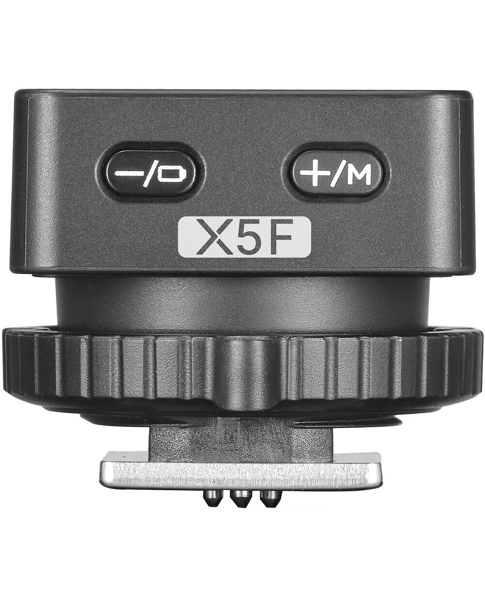 Конструкция Godox X5F объединяет в себе несколько важных элементов: встроенную горячую ногу для установки на камеру, механизм крепления для вспышки iT32, локальные органы управления и фиксирующее кольцо. Устройство не имеет собственной кнопки включения — активация происходит автоматически при подключении к вспышке или камере, а о состоянии работы сигнализируют цветные светодиодные индикаторы.