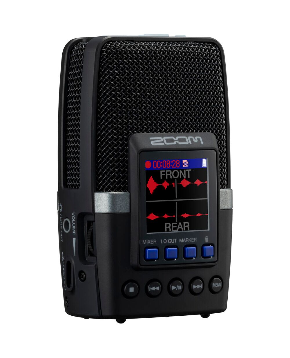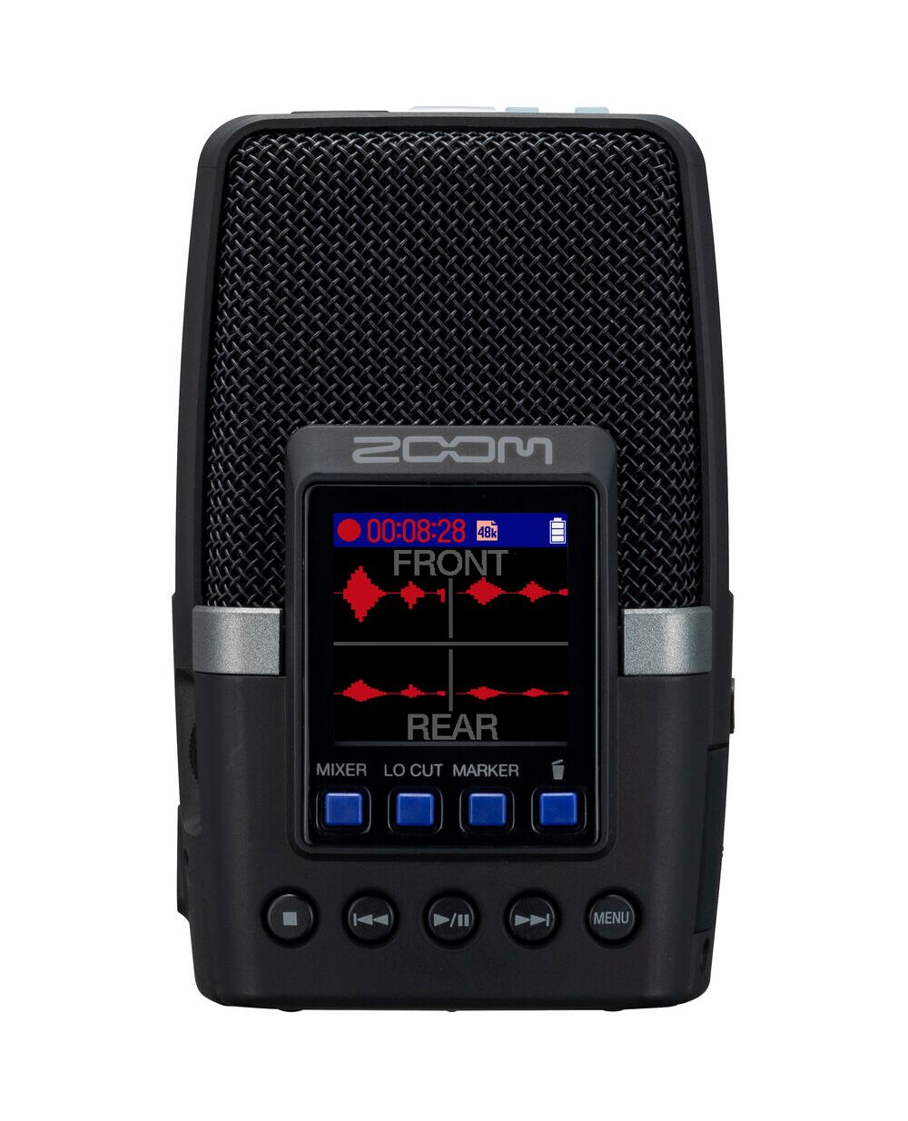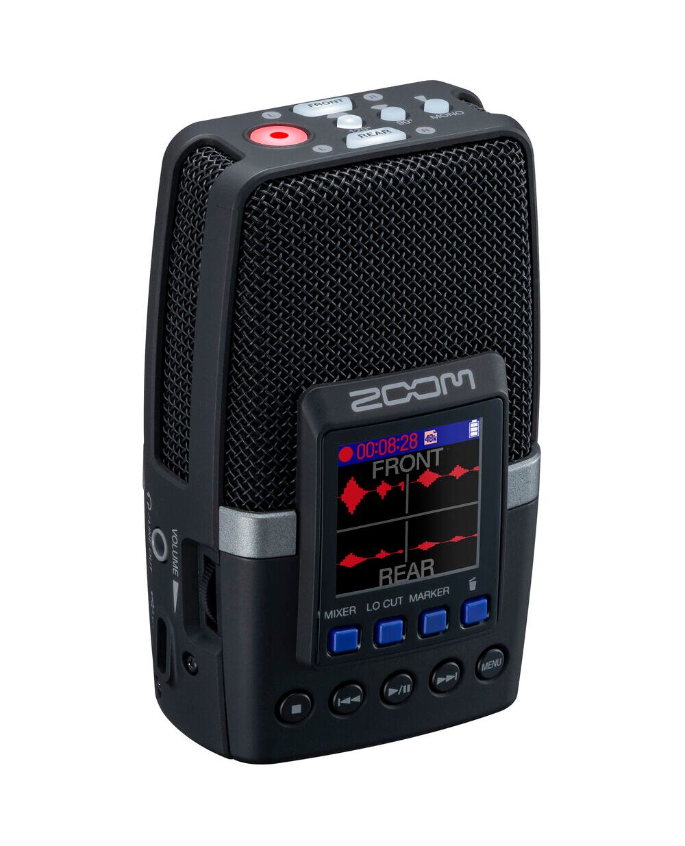 H2essential обладает продвинутыми функциями, такими как фильтр низких частот (Low-Cut), предварительная запись (Pre-record), авто-запись (Auto-record) и регулировка скорости воспроизведения. Выделенная кнопка Marker позволяет мгновенно устанавливать референсные точки во время записи.