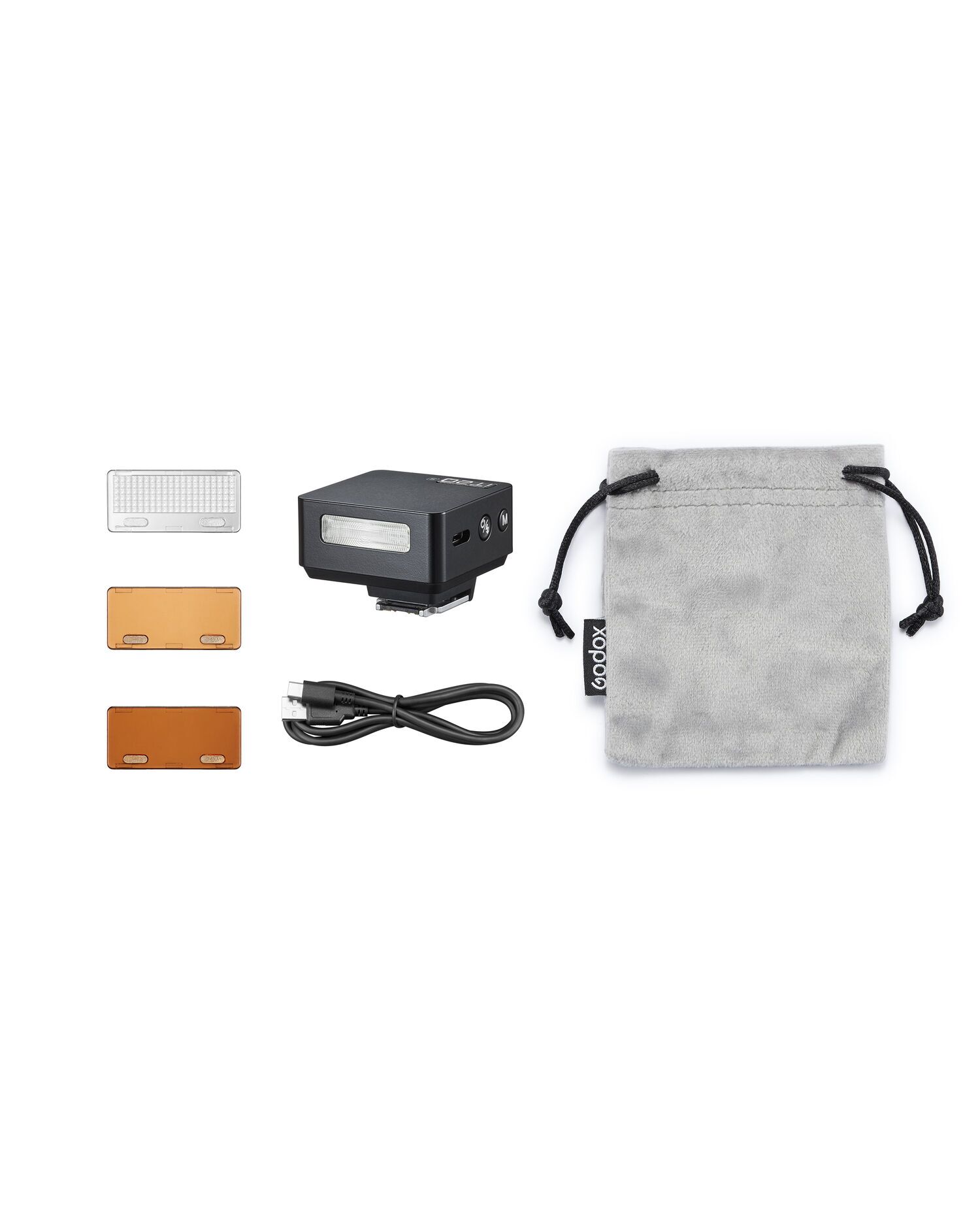 В комплект входят два магнитных цветовых фильтра: 1/1 (оранжевый) и 1/2 CTO (полуоранжевый) для коррекции цветовой температуры. Они легко крепятся к фронтальной части вспышки, расширяя творческие возможности. Также в коробке вы найдете USB-C кабель для зарядки и удобный чехол для хранения и переноски.
